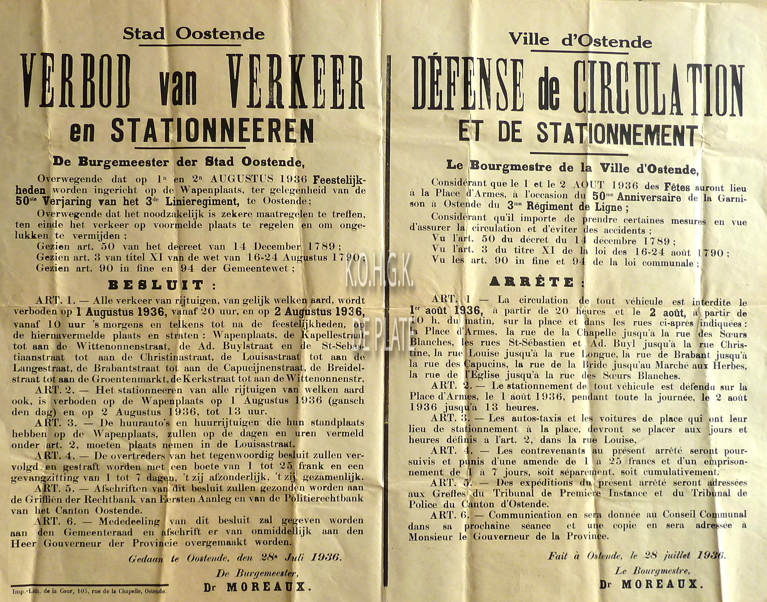 Formaat : 56 x 71 cm. - Tweetalig. - Verkeersreglement naar aanleiding van de feestelijkheden op het Wapenplein ter gelegenheid van de 50ste verjaring van het 3de Linieregiment, op 1 en 2 augustus 1936