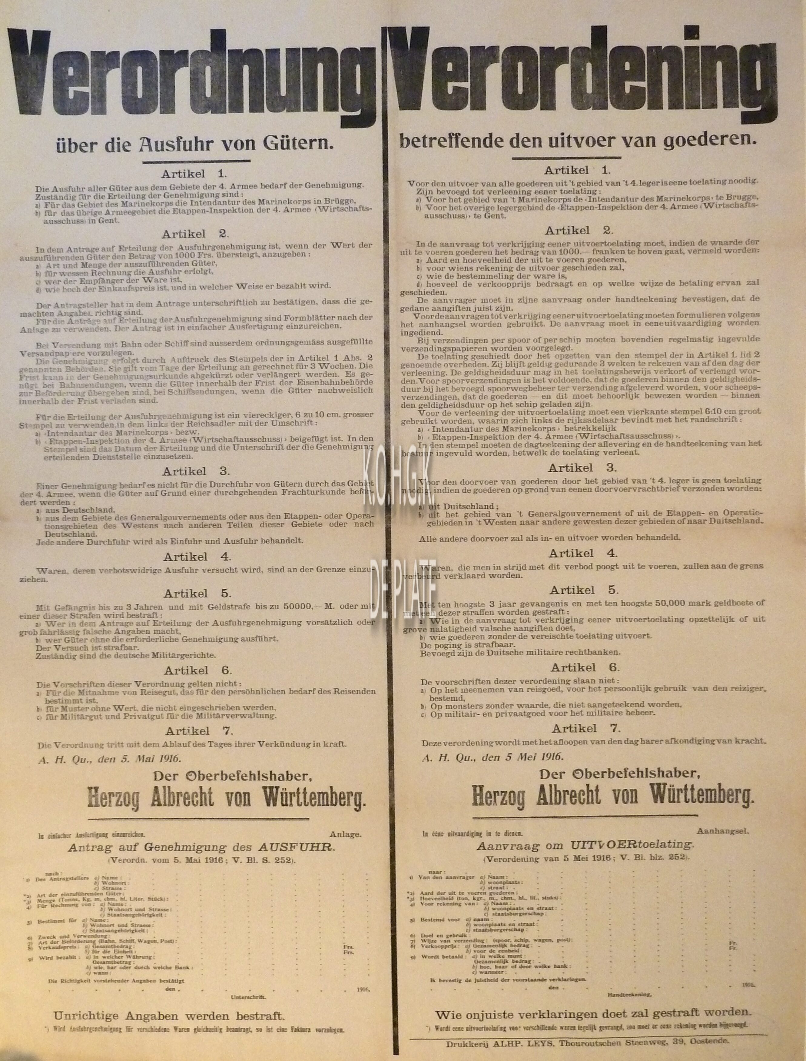 Formaat : 85 x 62 cm. Kennisgeving uitgaande van de opperbevelhebber Herzog Albrecht von Württemberg betreffende de uitvoer van goederen uit het gebied van het 4de Leger