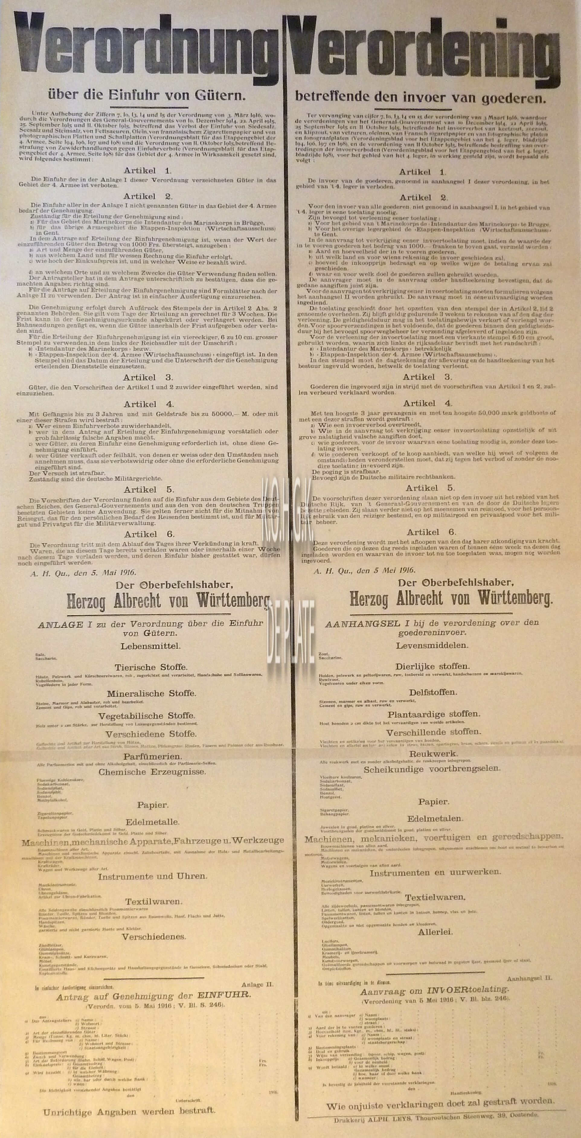 Formaat : 124 x 62 cm. Kennisgeving uitgaande van de opperbevelhebber Herzog Albrecht von Württemberg betreffende de invoer van goederen in het gebied van het 4de Leger
