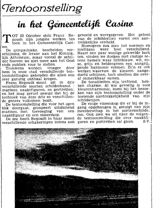 Trefwoorden REGOUDT FRANS (1906-1977) (KUNSTSCHILDER LERAAR) KUNSTTENTOONSTELLINGEN KONINKLIJKE SCHOUWBURG (VAN ISEGHEMLAAN) ; TENTOONSTELLINGEN Plaatskenmerk O.D.P.-archieven. Bibliotheek Kris Lambert VISS1948 08-10-1948 Bron Het Nieuw Visscherijblad Pagina's 7,ill. Print
