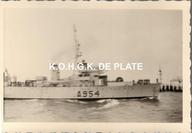 Foto van de A.954 Adrrien de Gerlache en tekening van de M.920 Iris, afgestempeld op 01-03-1989. De Zeemacht wordt op 1 maart overgeheveld naar landsverdediging. Le passage de la Force Navale à la Défense Nationale d'…