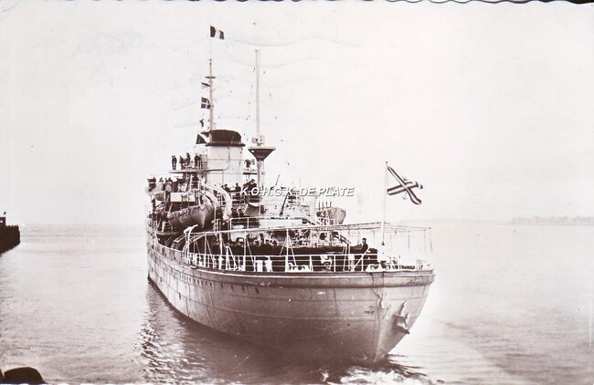 Links Paul DEPAEPE die een of andere oorkonde krijgt aan boord van de Kamina (Zeemachtschip).