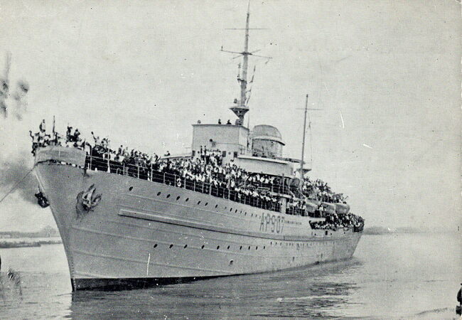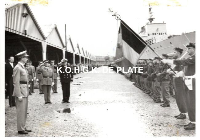 Formaat : 13 x 18 cm. - Het troepentransportschip de "Kamina" dat onze troepen uit Congo terugbracht, ligt aangemeerd in het Houtdok. Koning Boudewijn was er om hen te verwelkomen.