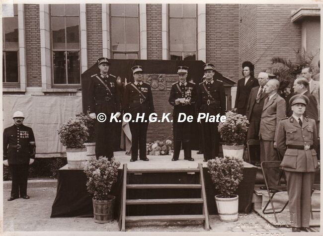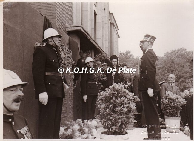 Formaat : 18 x 13 cm. - Inhuldiging herdenkingsplaat voor de vermiste en de politieagenten die voor het vaderland stierven. Plechtigheid nabij het Gerechtshof, toen dienstdoend stadhuis en centraal politiecommissariaat.…