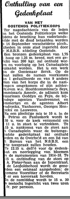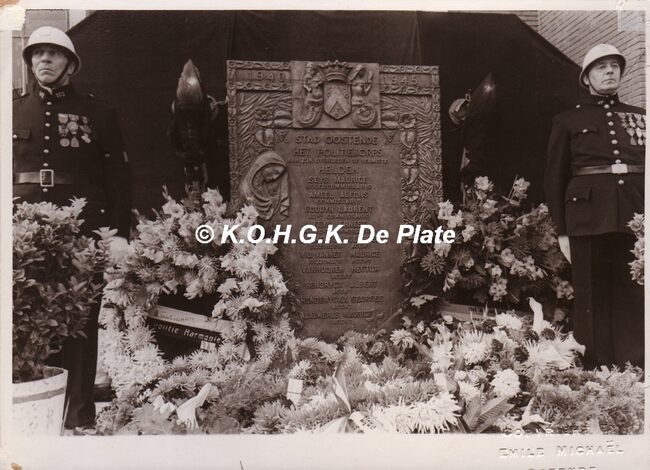 Formaat : 18 x 13 cm. - Inhuldiging herdenkingsplaat Potitiekorps Oostende "Aan zijn overleden of vermiste helden". Deze plaat hangt sedert mei 1971 in de grote hall van het stadhuis. Ontworpen door de Gentse…