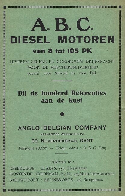 ABC Diesel Motoren van 8 tot 120 PK. Leveren zekere en goedkoope drijfkracht voor de visscherijnijverheid zoowel voor schroef als voor dek. Bij de honderd referenties aan de kust. Anglo Belgian Company. Naamlooze…