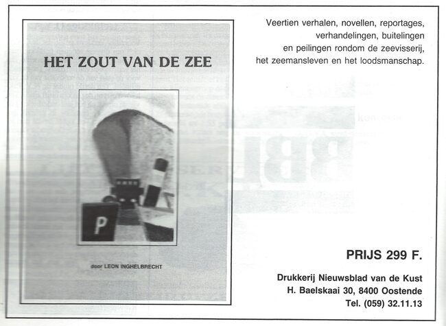 Advertentie : Het zout van de zee / door Leon Inghelbrecht. - Veertien verhalen, novellen, reportages, verhandelingen, buitelingen en peilingen rondom de zeevisserij, het zeemansleven...drukkerij Nieuwsblad van de Kust. - Prijs 299 F.