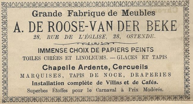 Immense choix de papiers peints. Toiles cirées et linoleums. - Glaces et tapis. Chapelle ardente, cercueils. Marquises, tapis de noce, draperies. Installation complète de villas et cafés. Superbes étoffes pour le carnaval…