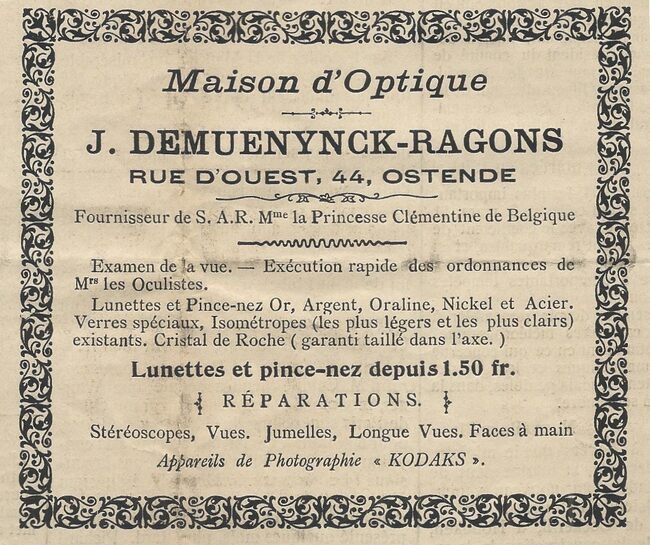 Fournisseur de S.A.R. Mme la Princesse Clémentine de Belgique. Examen de la vue. Exécution rapide des ordonnances de Mrs les oculistes. Lunettes et pince-nez or, argent, oraline, nickel et acier. Verres spéciaux,…
