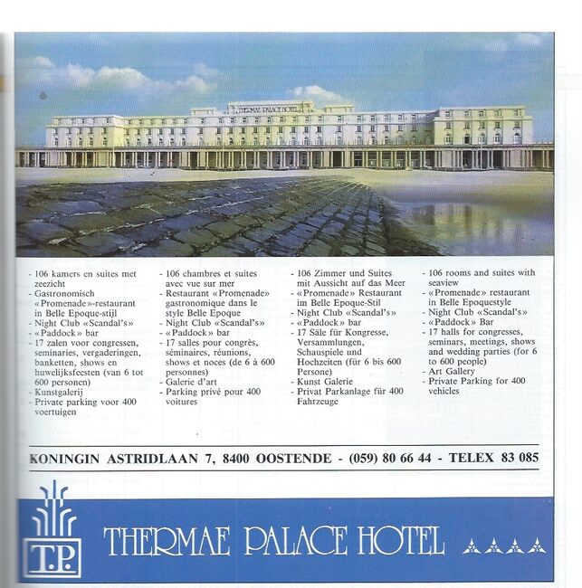 Déjeuners sur la terrasse. Diners dans la salle des ambassadeurs. Direction : Matheudi & Hertault du Palace Hotel de Bruxelles.