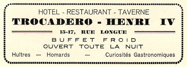 Buffet froid. Ouvert toute la nuit. Huîtres, homards, curiosités gastronomiques.