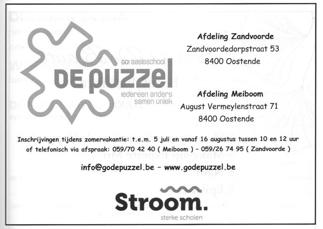 Advertentie : De Puzzel. GO! Basisschool. Afdeling Zandvoorde. Zandvoordedorpstraat 53. Afdeling Meiboom. August Vermeylenstraat 71, Oostende