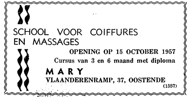 Advertentie : Mary. School voor coiffures en massages. Vlaanderenstraat 37, Oostende