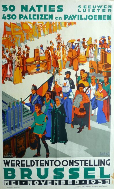 Formaat : 100 x 62 cm. - 30 Naties. 450 Paleizen en Paviljoenen. 5 eeuwen luister. - Rechts onder : J.v.d Bergh 1935. - Links onder : Creations L. Lumen