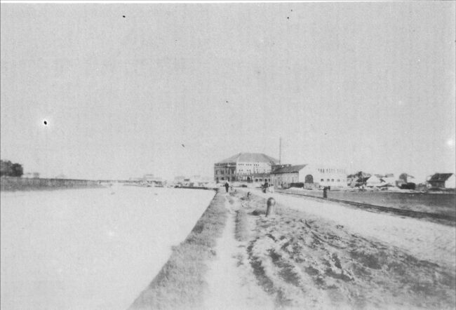 Foto : De eerste Oostendse verbrandingsoven (1909). - Gelegen langs het kanaal Oostende Brugge. In de volksmond ''strontfabriek'' genoemd