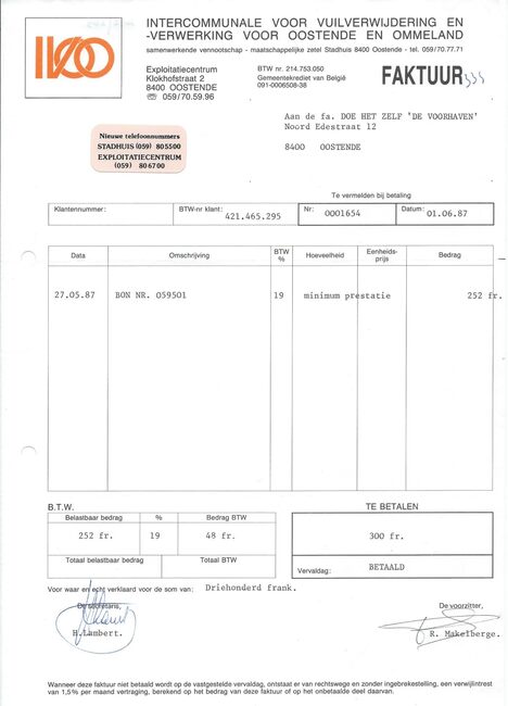 Factuur : IVOO. Intercommunale voor vuilverwijdering en -verwerking voor Oostende en ommeland. Exploitatiecentrum : Klokhofstraat 2, Oostende