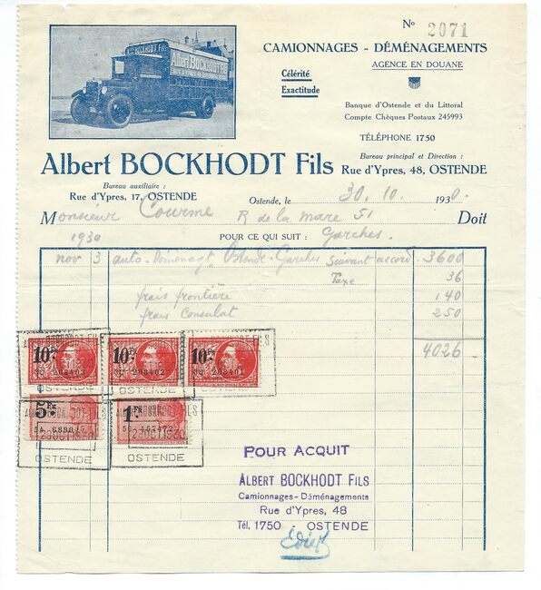 Factuur : Albert Bockhodt Fils. Vervoer - Verhuizingen. Ieperstraat 48, Oostende
