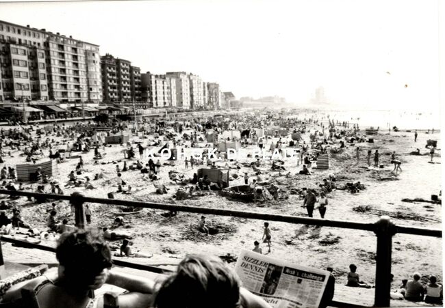 Formaat : 9 x 12,5 cm. - Strandrecreatie op het Groot Strand. Rechts, de Koninklijke Gaanderijen en het Thermae Palace Hotel. Wat verder, de Nieuwe Gaanderijen en de Koninklijke Villa. De woontoren "Europacentrum…