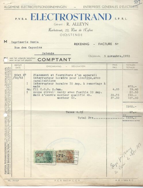 Factuur : Electrostrand. Algemene Electriciteitsondernemingen. Kerkstraat 22, Oostende