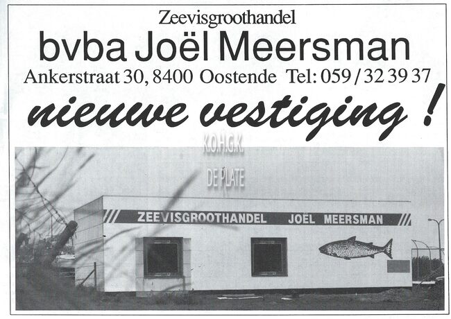 Advertentie : Zeevisgroothandel bvba Joël Meersman, Ankerstraat 30, 8400 Oostende, tel 059 / 32 39 37. - Nieuwe vestiging!. - Met foto