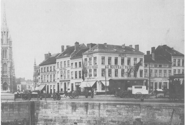 Centraal, het hotel-restaurant-café Au Nouveau Passage, gelegen op de hoek van het Sint Petrus en Paulusplein (links) en de Visserskaai (rechts). Links, het Au Grand Café du Midi en het…