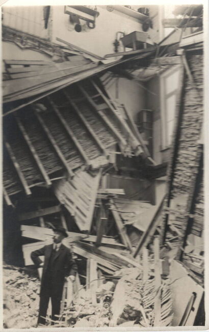 Formaat : 14 x 9 cm. - Tijdens de beschietingen van 22 september 1917 werden de woningen nrs 56 en 58 vernield. Hier de vernielde handelszaak "Au Moulin".