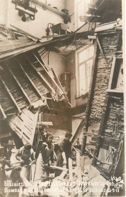 Nels. Edition René Baervoets, 7, rue Longue, Ostende. - Ostende - "Au Moulin", rue de la Chapelle. Effet d'un obus, le 22 septembre 1917. - Tijdens de beschieting van 22 september 1917 werden de woningen…
