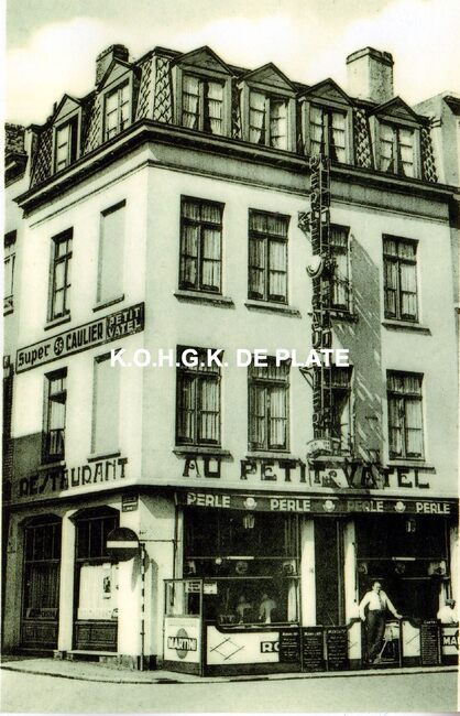 Afdruk postkaart. - Formaat : 19 x 12.5 cm. - Langestraat 16 : Het hotel café restaurant "Au Petit Vatel" met buitenterras, op de hoek met de Antoon Belpairestraat (links).