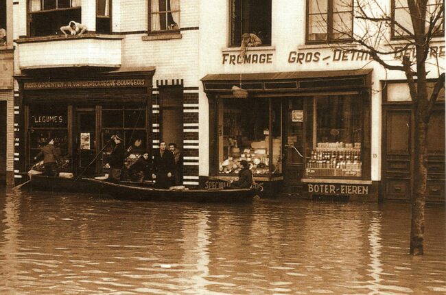 Tropic T 389. - Ostende oender woater 1953. - De Dwarsstraat gezien vanuit de Groentemarkt. Links, de groenten en fruithandel "A. Vanderschaeghe-Bourgeois" en ernaast, de kaaswinkel "Au Vert Pré" …