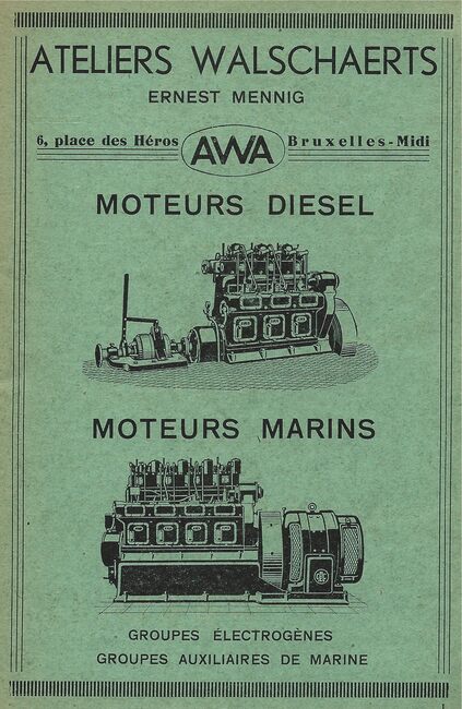 Advertentie : Ateliers Walschaerts, Ernest Mennig, 6, Place des Héros, Bruxelles-Midi. - AWA, moteurs diesel, moteurs marins, groupes électrogènes, groupes auxiliaires de marine
