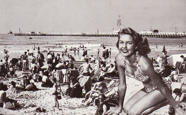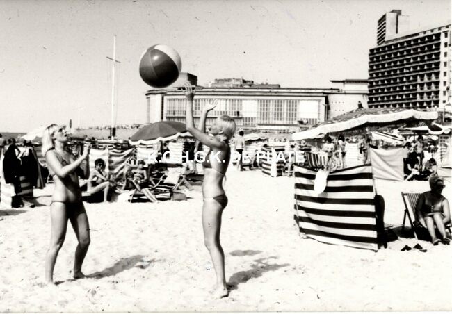 Formaat : 9 x 12,5 cm. - Strandrecreatie in het Lido op het Groot Strand. Op de achtergrond de westgevel van de vierde kursaal.