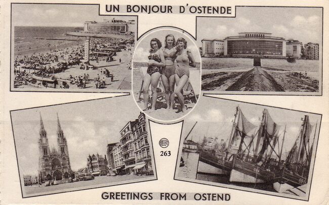 Albert. N° 5. - Ostende - La Plage. Ostend - The Shore. - Pootjebaden langs het groot strand in het Interbellum. Op de achtergrond het derde Kursaal