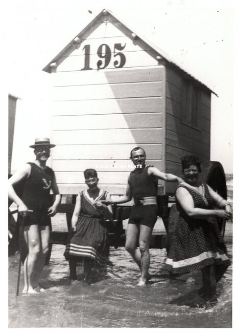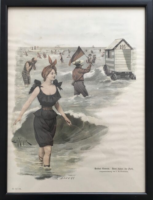 Formaat : 17,5 x 12,5 cm. - De badmode tijdens de Belle Epoque. Op de achtergrond, de traditionele badkarren