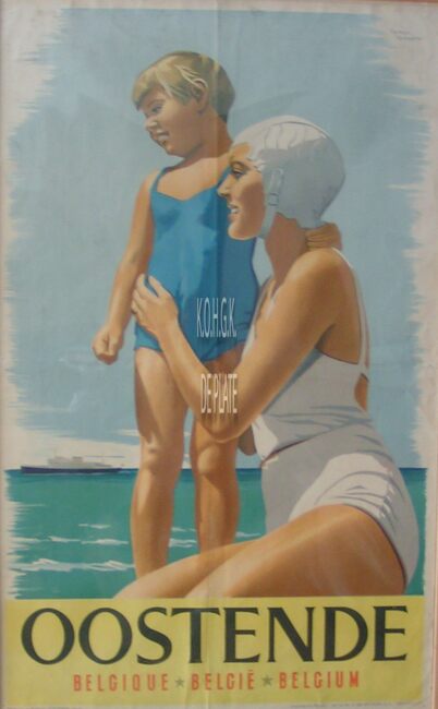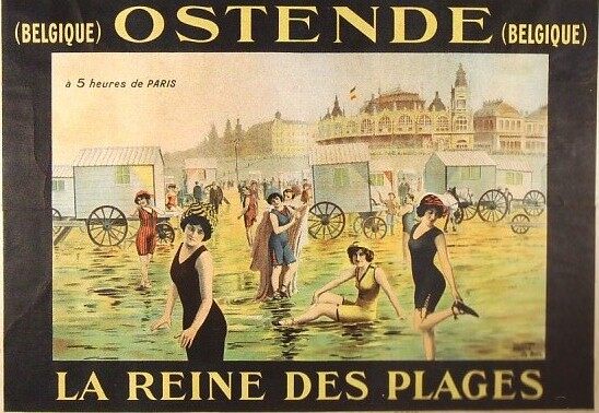 Affiche in kader, formaat : 145 x 110. - A 5 heures de Paris. De Belle Epoque. - Strandrecreatie met baadsters en op de achtergrond de traditionele badkarren en het Casino-Kursaal op de Zeedijk…