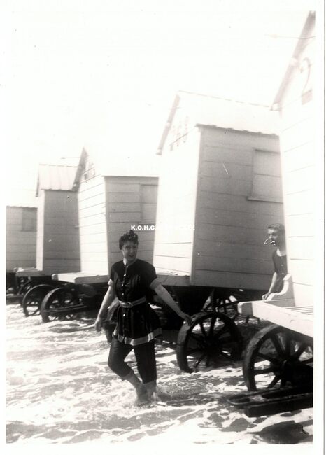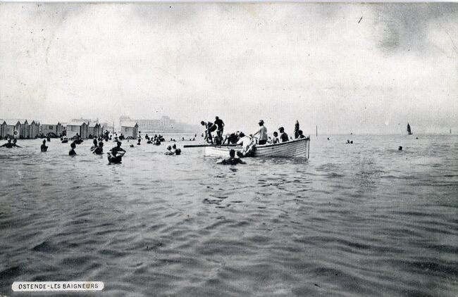 Herdruk. - Collectie archief Oostende. - Baadsters en badkarren met op de achtergrond het kursaal