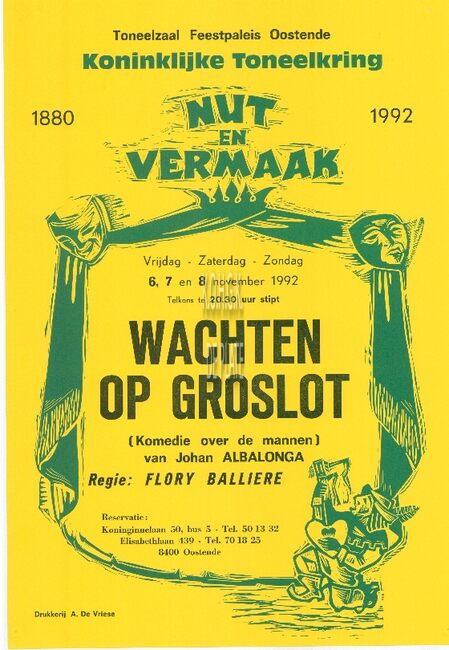 Affiche : Koninklijke toneelkring Nut en Vermaak. Wachten op Groslot. Feestpaleis Oostende. 6, 7, 8 november 1992.