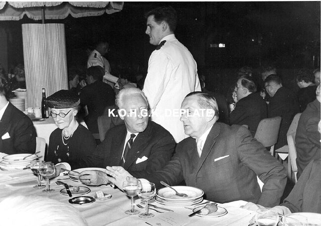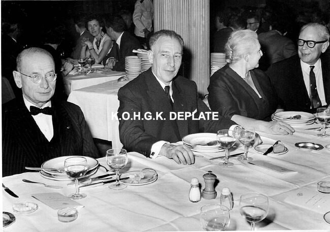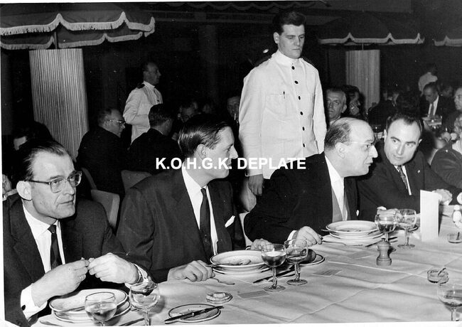 Formaat : 13 x 18 cm. - Tijdens het banket. Vooraan, burgemeester Jan Piers, met naast hem mevrouw De Ramée en Alfred Bertrand. Hij was toen minister van Verkeerswezen.