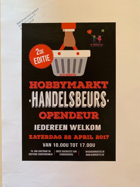 Affiche : Basisschool De Morootje. Hobbymarkt, Handelsbeurs. Opendeur. 2de editie. Thomas Van Loostraat 56. 22/04/2017