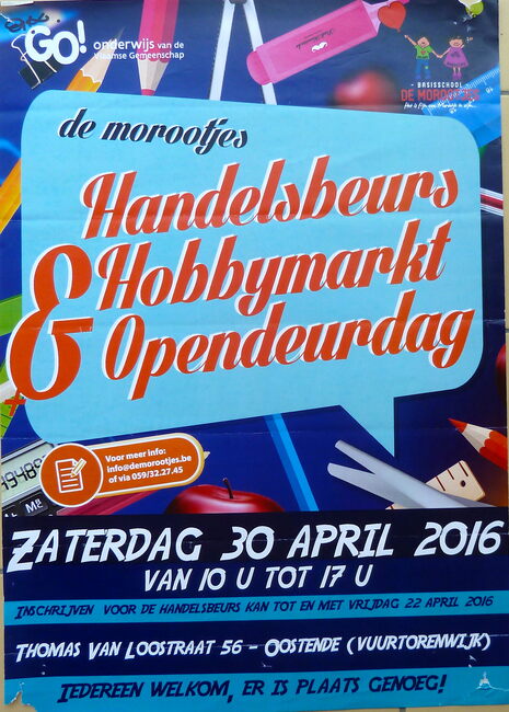 Affiche : Basisschool De Morootjes. Handelsbeurs, hobbymarkt en opendeurdag. Thomas Van Loostraat 56. 30/04/2016