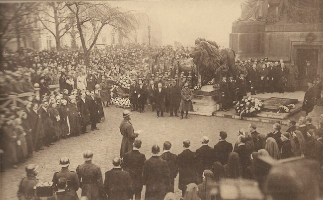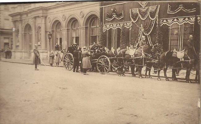 N°2. Sur un canon de campagne, portant encore les traces de la bataille, le corps du Soldat Inconnu est placé pour être transporté triomphalement au pied de la colonne du Congrès. De begrafenisstoet gereed om te…