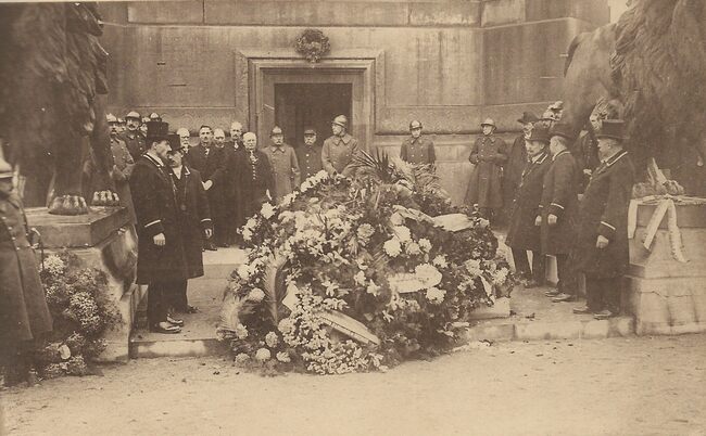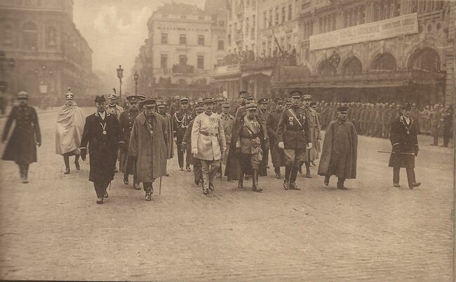 N°3. Les ministres d'Etat de droite à gauche M.M. Renkin, Cooreman, Goblet d'Alviela, Vandervelde (coiffé d'un chapeau mou), Hymans, suivent avec respect la dépouille glorieuse du Soldat Inconnu. - Van…