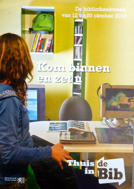 Affiche : Kom binnen en zet u. Thuis in de Bib. De bibliotheekweek van 12 tot 20 oktober 2013