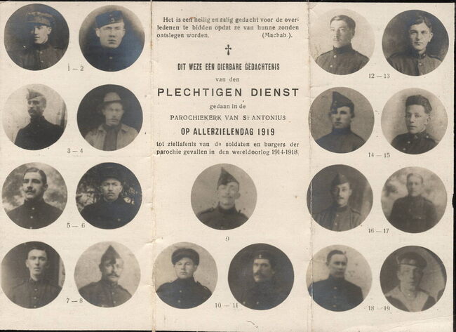 Dit weze een dierbare gedachtenis aan den plechtigen dienst gedaan in de parochiekerk van St. Antonius op Allerzielendag 1919 tot ziellafenis van de soldaten en burgers der parochie gevallen in den Wereldoorlog 1914-1918…