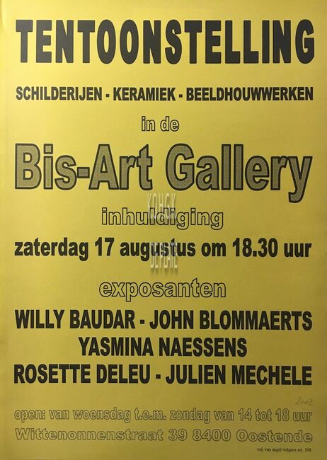 Affiche : Willy Bandar, John Blommaerts, Yasmina Naessens, Rosette Deleu en Julien Mechele. Tentoonstelling: schilderijen, keramiek en beeldhouwwerken. Bis-Art Gallery. Op 17 augustus 2002