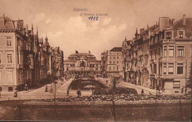 Albert Dohmen 2. - Ostende Avenue Léopold. De Leopoldlaan gezien richting de hoofdingang van het kursaal. Let op de altijd verzorgde bloemenparken door de groendienst van de stad