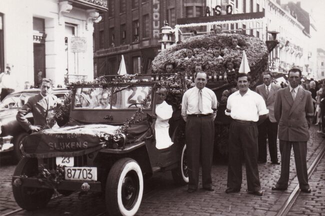 De personaliteiten wachten op de doortocht van de bloemencorso op het Wapenplein. Op de achtergrond de Kerkstraat. We herkennen, tweede van links schepen Emiel VROOME, naast hem burgemeester Henri SERRUYS, mevrouw SERRUYS…
