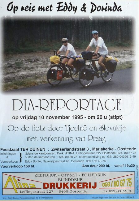 Affiche : Op reis met Eddy en Dorinda. Op de fiets door Tjechië en Slovakije met verkenning van praag. Oostende. 10 november 1995