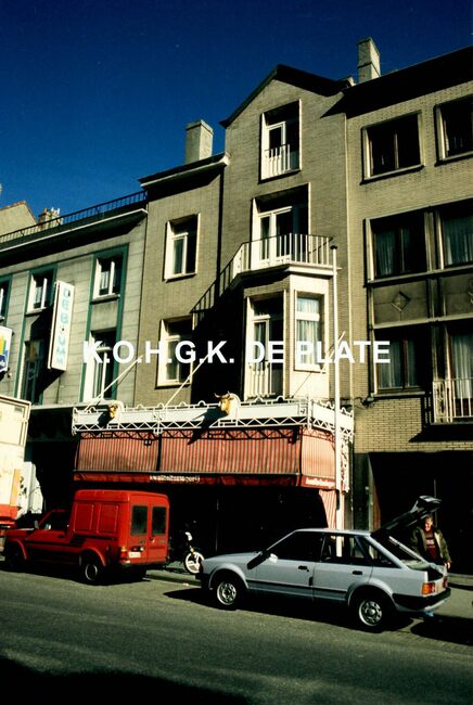 Formaat : 15 x 10 cm. - Keurslager Bossuyt, Torhoutsesteenweg 44. Hier kwam in 2013 appartementsgebouw ONYX II met op nummer 46 keurslager Derycker. Hier een mooi detail van de luifel met links ramskop en rechts rundskop…