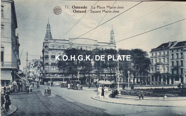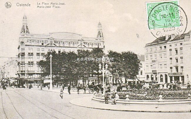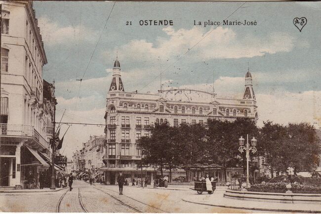 Ostende - La place Marie-José. - Bijgekleurde kaart. - In 1907 veranderde de Komedieplaats(plein) of Schouwburgplein (Place de théâtre) in Marie-Joséplein. Dit ter herinnering aan de geboorte van prinses Marie-José op 4…