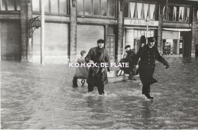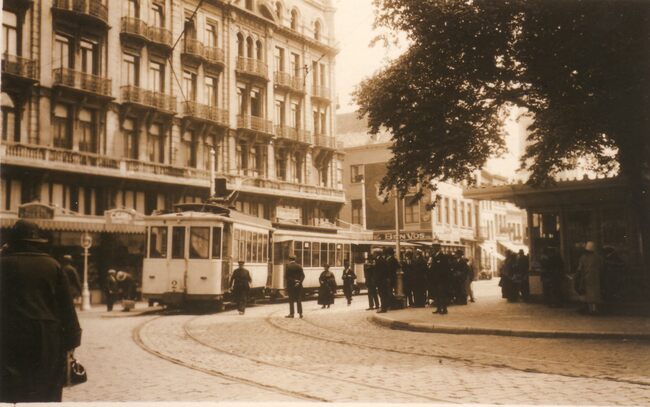 Foto (kopie), formaat : 13 x 9 cm. - De tram houdt halt aan het Marie-Joséplein. Rechts, het tramwachthuisje en link,s het Bouchery gebouw